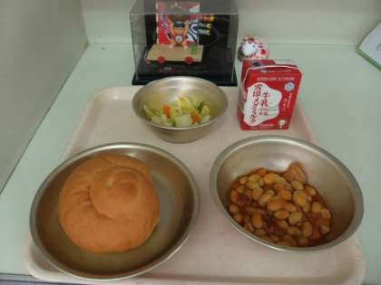 今日の献立はバターうずまきパン・牛乳・大豆と鶏肉のトマト煮・野菜のホットマリネです。1年生もグループになって食べています。「パンがぐるぐるなってる」とか「野菜を食べてみたらおいしかったわ」「キャベツがすっぱい」と言いながら食べていました。