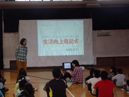「おぐり すっこ 向上先生」が登場して全校のみんなに,生活リズムをよくしていこうと呼びかけだあり,発足式が進みました。