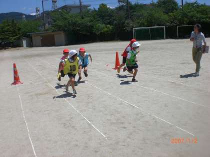 グループでどうすれば早く走れるのかを話し合いながら,リレーを行っていました。