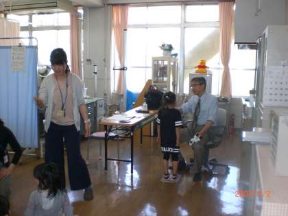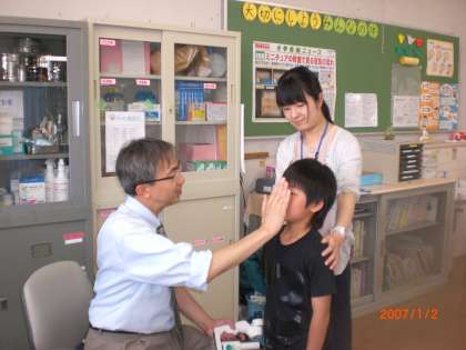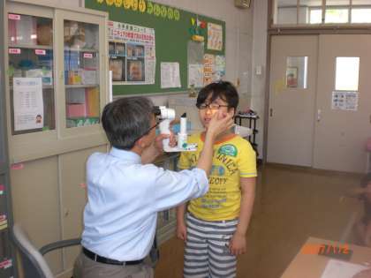 保健室でのルールをしっかり守って眼科検診を受けている児童の様子です。