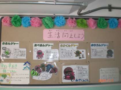 北校舎1階掲示板には,生活向上から「ねるんジャー・たべるんジャー・うごくんジャー・あらうんジャー・みがくんジャー」が掲示してあります。