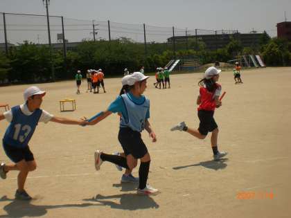 5年生は,体育の学習でリレーを行っています。昨日は,グループに分かれてバトンパスの練習を行いました。