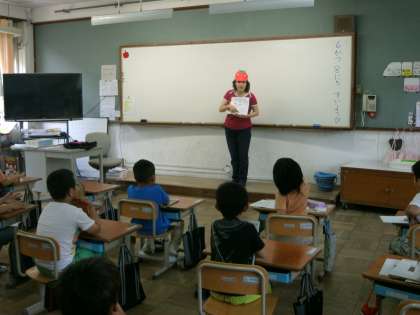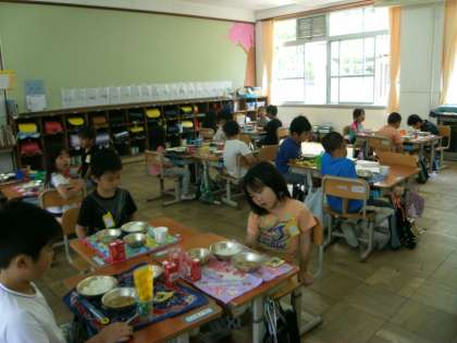 1年生の教室には朝から「トマトさん」がやってきました。「トマトはピーマンマンの友達だよ」と聞いて,「ということはバイキンをやっつける?」「体にいいってことか!」と言っていた1年生。配食された給食をみてちょっぴり不安そうな顔をしていますが,ちゃんと食べきれましよ!「だんご、もちもちしておいしいよ」と。