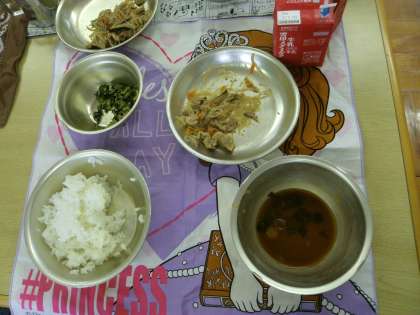 今日の献立はごはん・牛乳・豚肉とこんにゃくのいため煮・だいこん葉のごまいため・赤だしです。あまからい豚肉やごまの香ばしさがいい香りのだいこん葉はごはんとよく合います。あかだしには今日はみょうがが入っています。シャキシャキとした食感と香りが楽しめましたよ。
