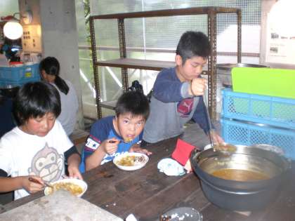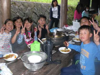 協力して作ったおいしいカレーをグループごとに食べました。