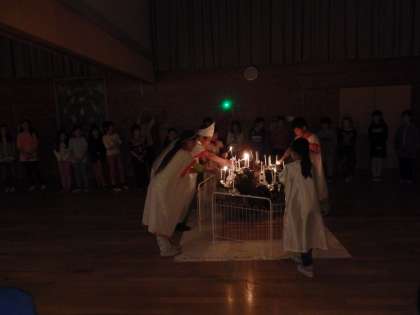 火の神様から火の子どもたちに4つの火が授けられました。「協力の火」「挑戦の火」「自立の火」「感謝の火」です。火の子たちからみんなで力を合わせて頑張ることを誓いキャンドルファイヤーが始まった。
