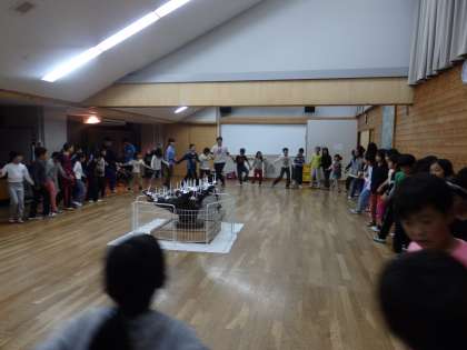 子どもたちに引き寄せられ,引率の教職員も一緒にマイムマイムをおどりました。