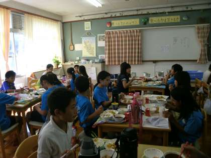 ランチルームの5年生は「ゴーヤの苦みがおいしいわ」「かぼちゃ、甘くておいしいよ」と言いながら食べていました。