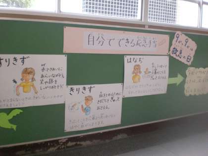 自分で小さな怪我などの手当ができるように,保健室前の掲示板に自分でできる応急手当が掲示されています。