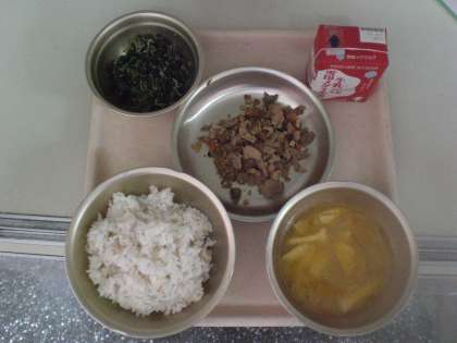 本日の献立は,ほうれんそうとじゃこのいためもの・とりめしのぐ・牛乳・麦ご飯・かぼちゃの味噌汁でした。