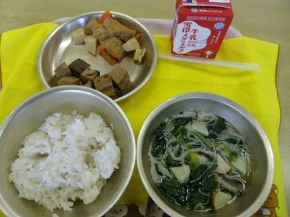 今日の献立は、麦ごはん・牛乳・なま節と厚あげの煮つけ・すまし汁(そうめん入)です。