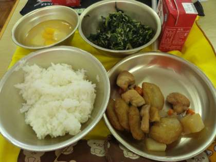 今日の献立はごはん・牛乳・平天とこんにゃくの煮つけ・ほうれん草とじゃこのいためもの・フルーツ寒天でした。