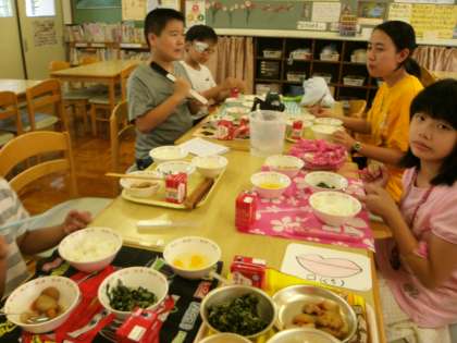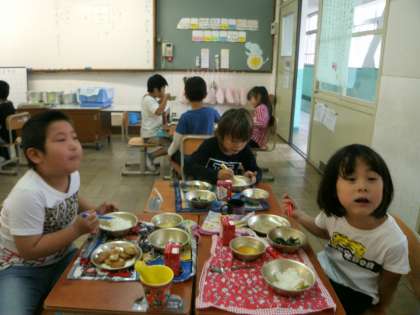 ランチルームでも,「うわ〜だんだん固まってきた」「ちょっとあまくてくだものは甘いよ」とだんだん固まる様子を楽しんでいました。