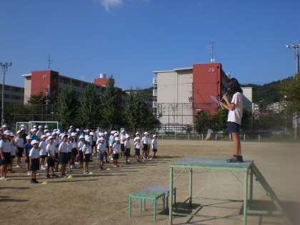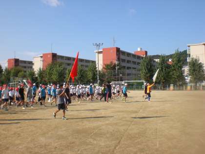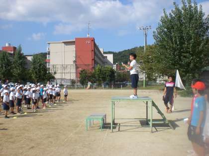 6年生が先頭になって,式の練習をみんなで行いました。開会宣言・はじめのことば・スローガン発表・優勝旗・準優勝盾返還や準備体操などの練習を行いました。