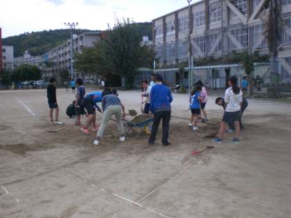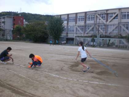 運動会に向けて運動場のラインテープの整備などを教職員が行いました。