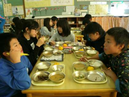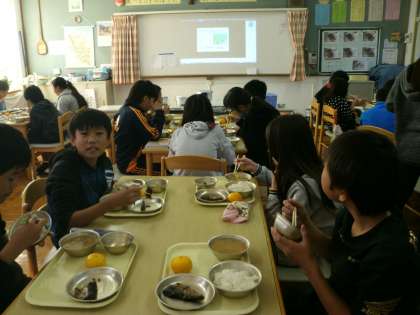 ランチルームの6年生も「九条ネギって高いんか?ちょうどいいうまさやな」「ブロッコリーもおいしいな」「にしんはごはんとみそ汁ともよく合うわ」「みかん甘っ!」と言いながら食べていました。