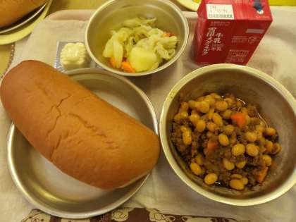 今日の献立は黒糖コッペパン・牛乳・チリコンカーン・野菜のホットマリネ・型チーズです。
