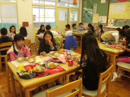 ランチルームの5年生は今日もおかわりに長蛇の列ができていました。