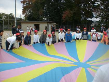「なかよしバルーン」では,日野小学校の交流学級と協力してバルーンを使った演技をして楽しみました。