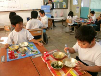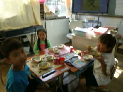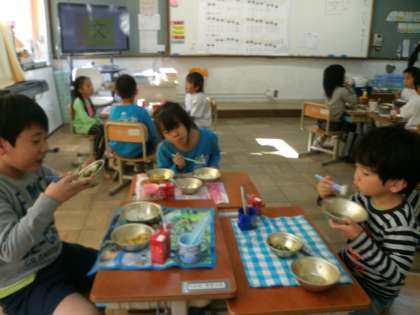 今日の献立はごはん・牛乳・あげたま煮・ほうれん草とはくさいのごま煮です。旬の青ネギが入ったあげたま煮は卵の黄色との相性も良く彩りがきれいでした。