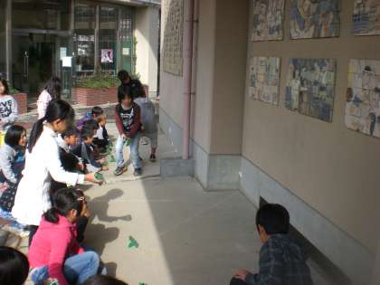 子ども達は反射させた太陽の光の筋道が地面に映るようにして光の進み方を調べました。