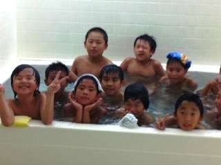 今日はいっぱい汗をかきました。大きな湯船にみんなでつかって,あ〜いい湯だな〜。お風呂からあがったら,校長先生のこわ〜いお話の後,いよいよきもだめしです。