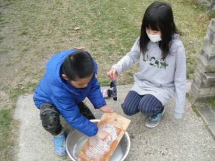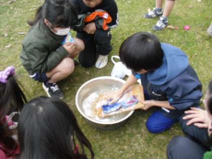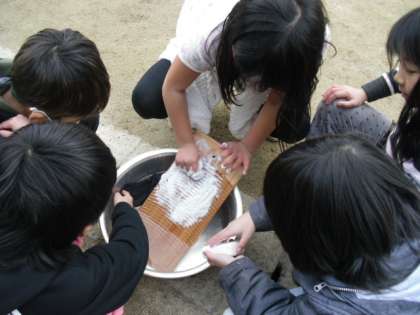 3年生は,「地域や生活の移り変わり」『昔を伝えるもの』を学習しています。今日は昔の道具(洗濯板やたらい)を使って,実際に靴下などをあらっていました。