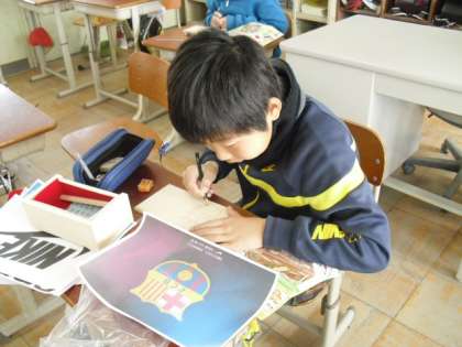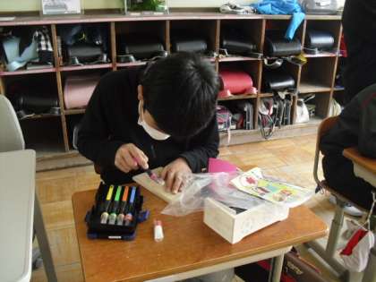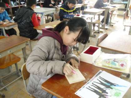 思い出に残る言葉や場面,模様などを丁寧に彫ったり色をつけたりしています。