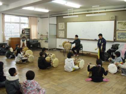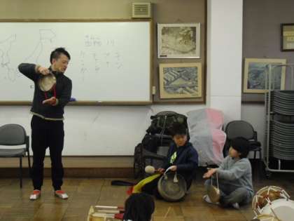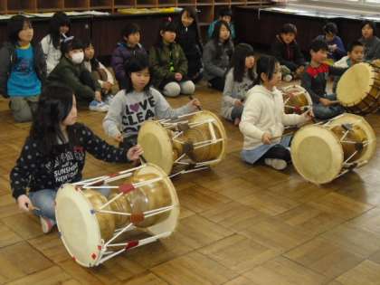 3年生は,京都府名誉友好大使に来ていただき,韓国・朝鮮の文化・国の様子や伝統的な楽器を教えていただき,演奏しました。