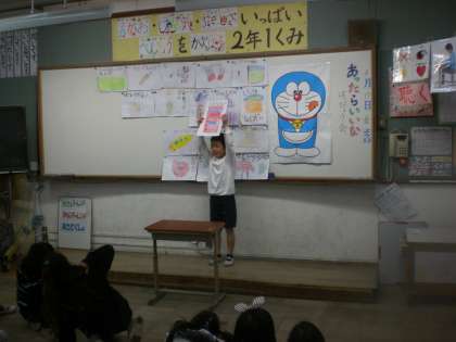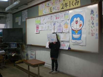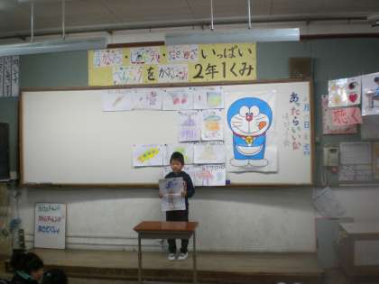 2年生は,あらかじめ作った文章をみんなの前で発表しました。1年生も発表会に参加してくれました。