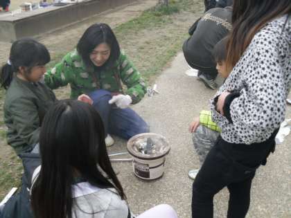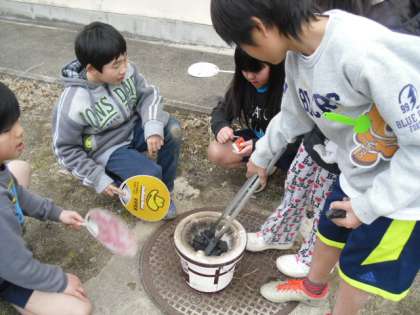 「昔の道具」七輪を使って,火をこしをしました。なかなかつかない七輪の炭をうちわなどで必死にあおいで火をこしをしました。