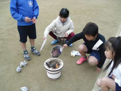 画像は,火をおこしているときの様子です。