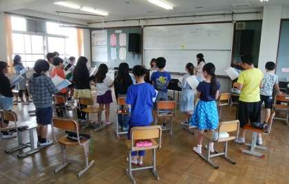 今年度も,高学年の音楽は,スクールサポーターの吉田先生と一緒に学習をします。