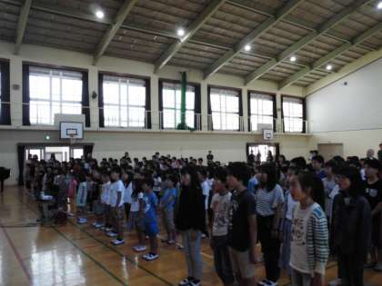 6月5日の朝会で,全校合唱をしました。今回は,まず6年生の手本から「良いところ見つけ☆」をしました。聴いていた下級生からは,口がしっかり開いていることや,ほっぺたが上がり表情が素敵なところに気付き,発表してくれました。また,歌声がきれいということを言ってくれたことに対して,6年生からは,どのようにして歌うとよいのかのポイントを教えてくれました。そのあと,歌声で歌詞の朗読を全校でしました。姿勢や声の出し方のポイントを確認した後,いよいよ全校合唱です。「ともだちはいいもんだ」を美しい響きのある歌声で歌うことができ,気持ちの良い一週間が始まりました。