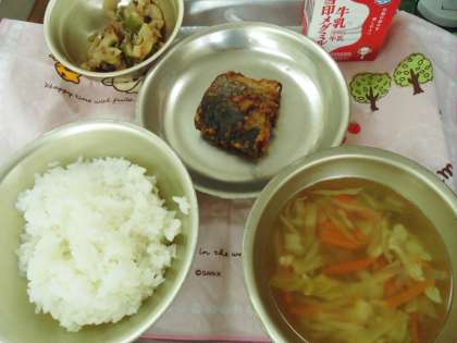 京都産のキャベツを使った吉野汁はキャベツの甘味もあり,けずりぶしのだしがきいておいしいです。3年2組では「うわ〜ピーマンみたいで苦い」「さわら,ちょっと苦手だけど食べきれたよ」「吉野汁おかわりほしい」と言いながら味わって食べていました。