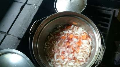 野菜も上手にきれました。お肉も投入しました。木を組んで火もうまくつきました。後は、美味しく煮えるのを待ちます。お天気ももっています。
