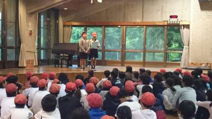 小栗栖宮山小学校と七条第三小学校合同の朝のつどいです。それぞれの学校の様子をしっかり紹介することができました。