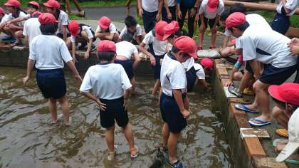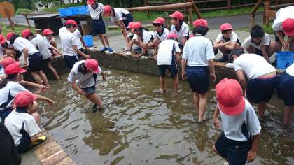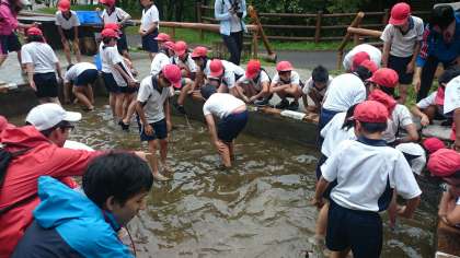 奇跡的に雨があがり,屋外で魚つかみをしています。子どもたちの歓声が山に響き渡ります🎵