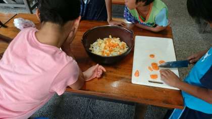 1日目の夜の食事は,野外炊事です。みんなで協力してカレーをつくります。