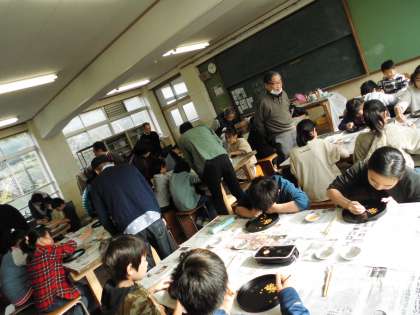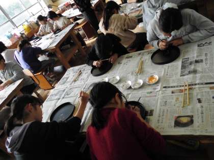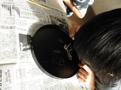蒔絵とは,漆器の表面に漆で絵を描き,その上に金属粉を蒔く技法です。子どもたちは,集中して蝶や花などの絵を描き作品を完成させることが出来ました。