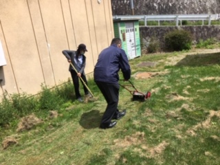 芝生の手入れの方法を教えてもらっていると,たくさんの教職員が集まってきました。みんなが使う場所をきれいにすることは,とても気持ちがよいことです。休業中も学校が再開するときに児童のみなさんが過ごしやすいようにいろいろな準備を進めています。
