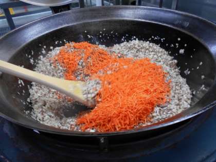 牛ひき肉・たまねぎ・にんじんを炒めて,水・トマトケチャップ・トマトピューレ・小麦粉・ウスターソース・塩・こしょうを入れ,じっくりと煮て作りました。