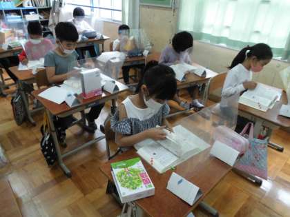 国語科で国語辞典の使い方を学習しました。子どもたちは国語辞典を使うのが楽しみで仕方がない様子でした。国語辞典の「つめ」「はしら」を手掛かりに,自分の調べたい語句を探していく・・・。なかなか見つけられなくても粘り強く探している子がたくさんいました。見つけた時には「あった!」と嬉しそうな笑顔がはじけていました。