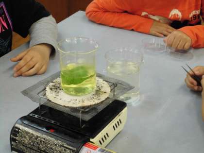 本日(5月10日)は,5時間目に理科室で実験をしました。日光が当たっている葉と当たっていない葉を比べて,ヨウ素液を使ってでんぷんができているかを調べました。熱湯にも気を付けてグループで協力して安全に実験に取り組むことができました。