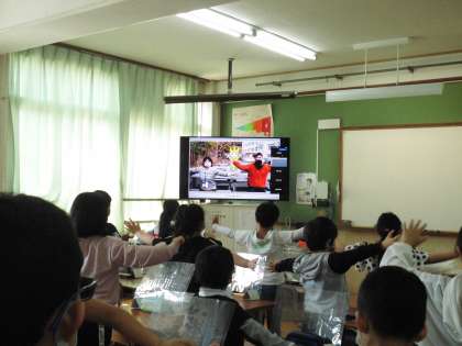 朝会の最後には,「一日一歩の未来」の音楽に合わせて体を動かしました。