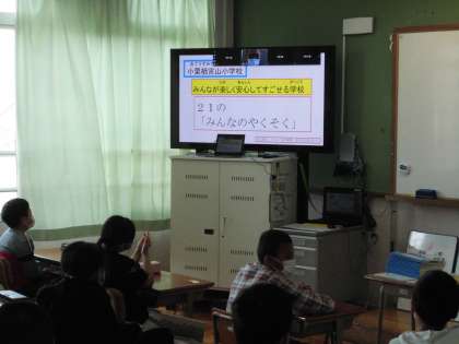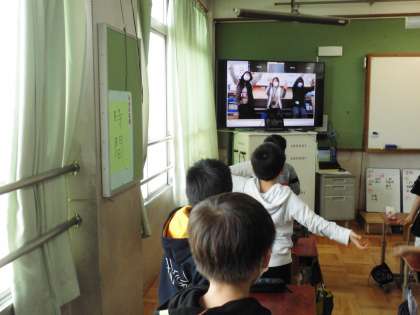 朝会の最後には心を込めてみんなで全校合唱の歌に合わせて体を動かしました。