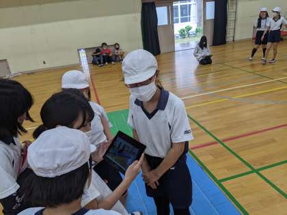技と技のつなぎを綺麗にするためにどうしたらいいかを,タブレットで動画を撮り,友だちと相談する姿が見られました。