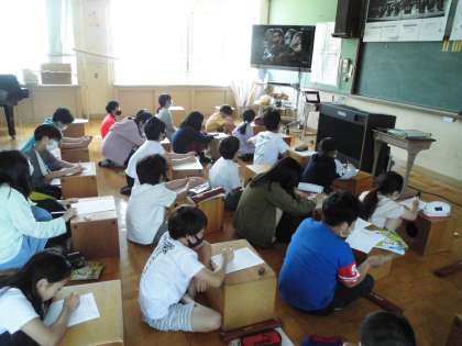 音の重なり方に着目して「アイネクライネナハトムジーク 第1楽章」を鑑賞しました。旋律を覚えるくらい集中して聴くことができている児童もいました。