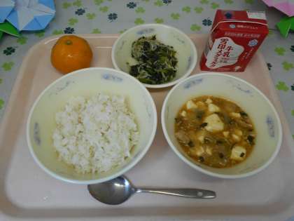 「とうふの四川風」は,豚肉・しょうが・たまねぎ・しいたけを炒めて煮,小松菜,とうふを加えて,さとう・トマトケチャップ・トウバンジャン・塩・しょうゆで味つけをしました。