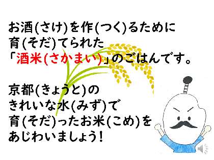 今日のごはんは,お酒を作るために育てられた「酒米」のごはんでした。いつもとのお米との違いを感じながら食べている子もいました。